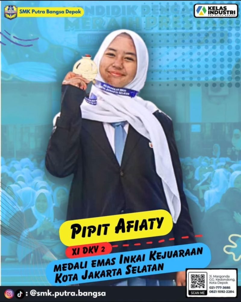 Kabar membanggakan kembali datang dari keluarga besar SMK Putra Bangsa Depok. Salah satu siswi terbaiknya, Pipit Afiaty dari kelas XI DKV 2 (Desain Komunikasi Visual), berhasil meraih Medali Emas pada ajang kejuaraan yang diselenggarakan oleh Institut Karate-Do Indonesia (INKAI) tingkat Kota Jakarta Selatan.