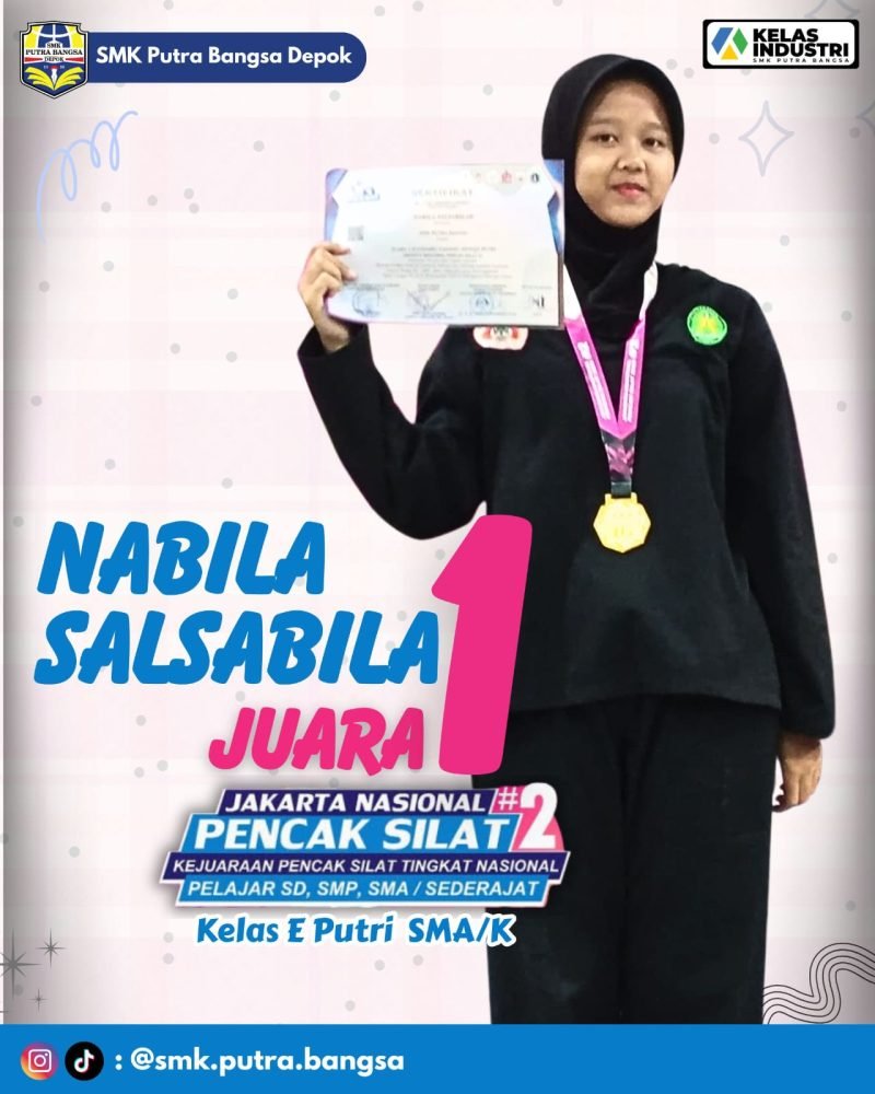 Prestasi membanggakan kembali ditorehkan oleh siswi SMK Putra Bangsa Depok, Nabila Salsabila. Dengan semangat juang dan dedikasi tinggi, Nabila berhasil meraih Juara 1 dalam ajang Jakarta Nasional Pencak Silat #2 pada kategori Kelas E Putri SMA/K. Kejuaraan tingkat nasional ini diikuti oleh pelajar dari berbagai daerah di Indonesia, mulai dari jenjang SD, SMP, hingga SMA/sederajat....