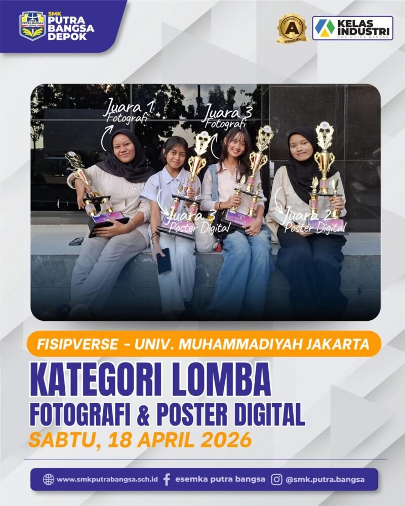 Kabar membanggakan kembali datang dari siswa-siswi SMK Putra Bangsa Depok yang berhasil menorehkan prestasi dalam ajang Fisipverse 2026 yang diselenggarakan oleh Universitas Muhammadiyah Jakarta. Kompetisi yang berlangsung pada Sabtu, 18 April 2026 ini mempertandingkan berbagai kategori, termasuk Fotografi dan Poster Digital.